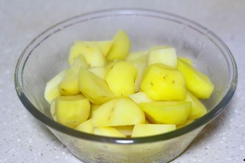 3. 切块:将土豆切成块状,大小根据个人喜好而定。一般来说,块状越小,烤制时间越短。